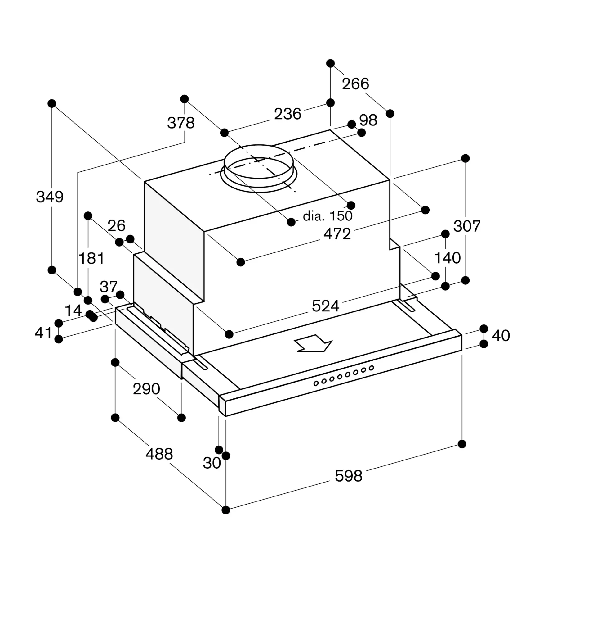 The required cavity height of the upper cabinet together with the lowering frame measures 600 mm.