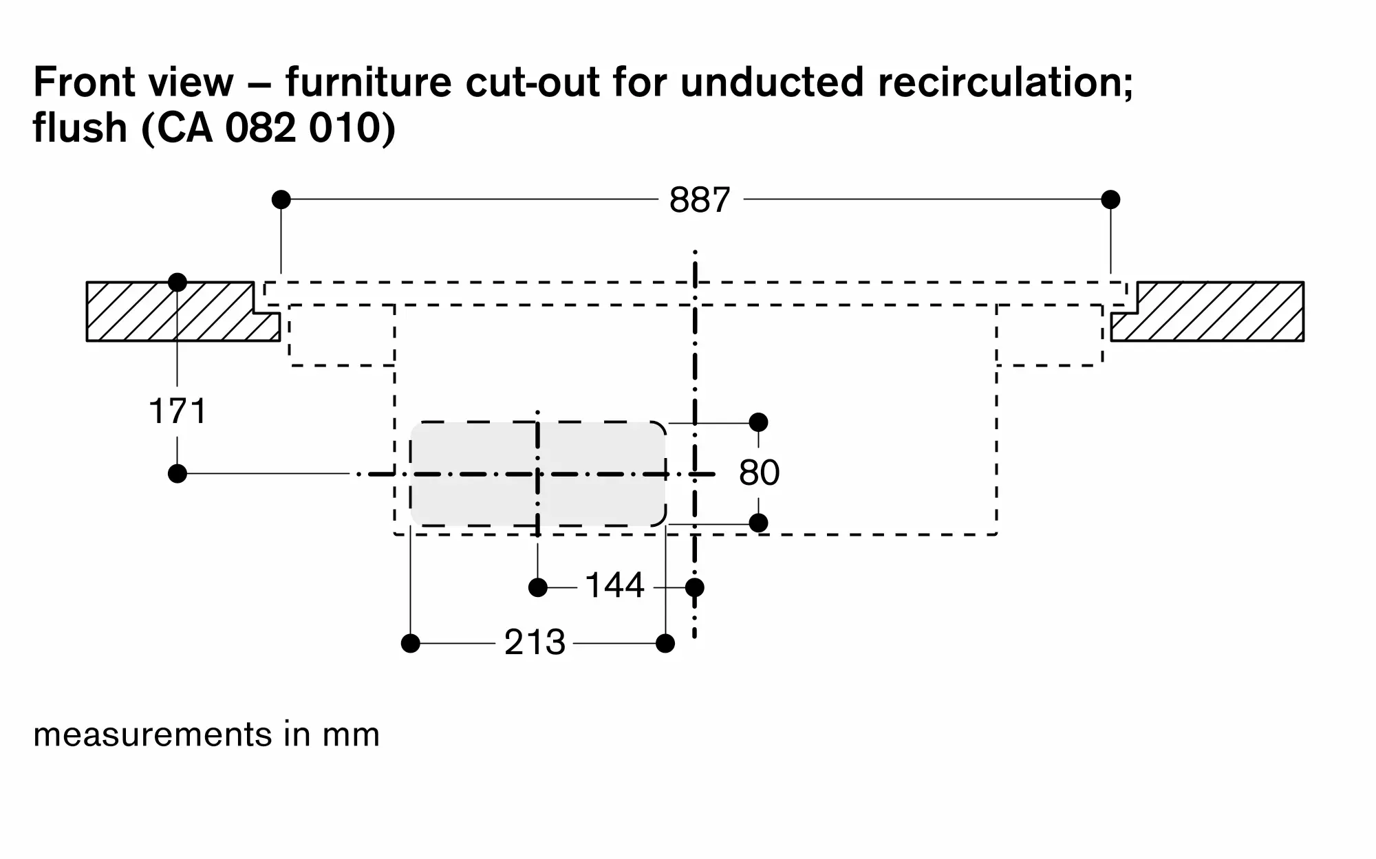 The unducted recirculation set CA 082 010 requires a vertical aperture of min. 25 mm behind the backpanel of the furniture. Suggested for ideal performance are 50 mm.