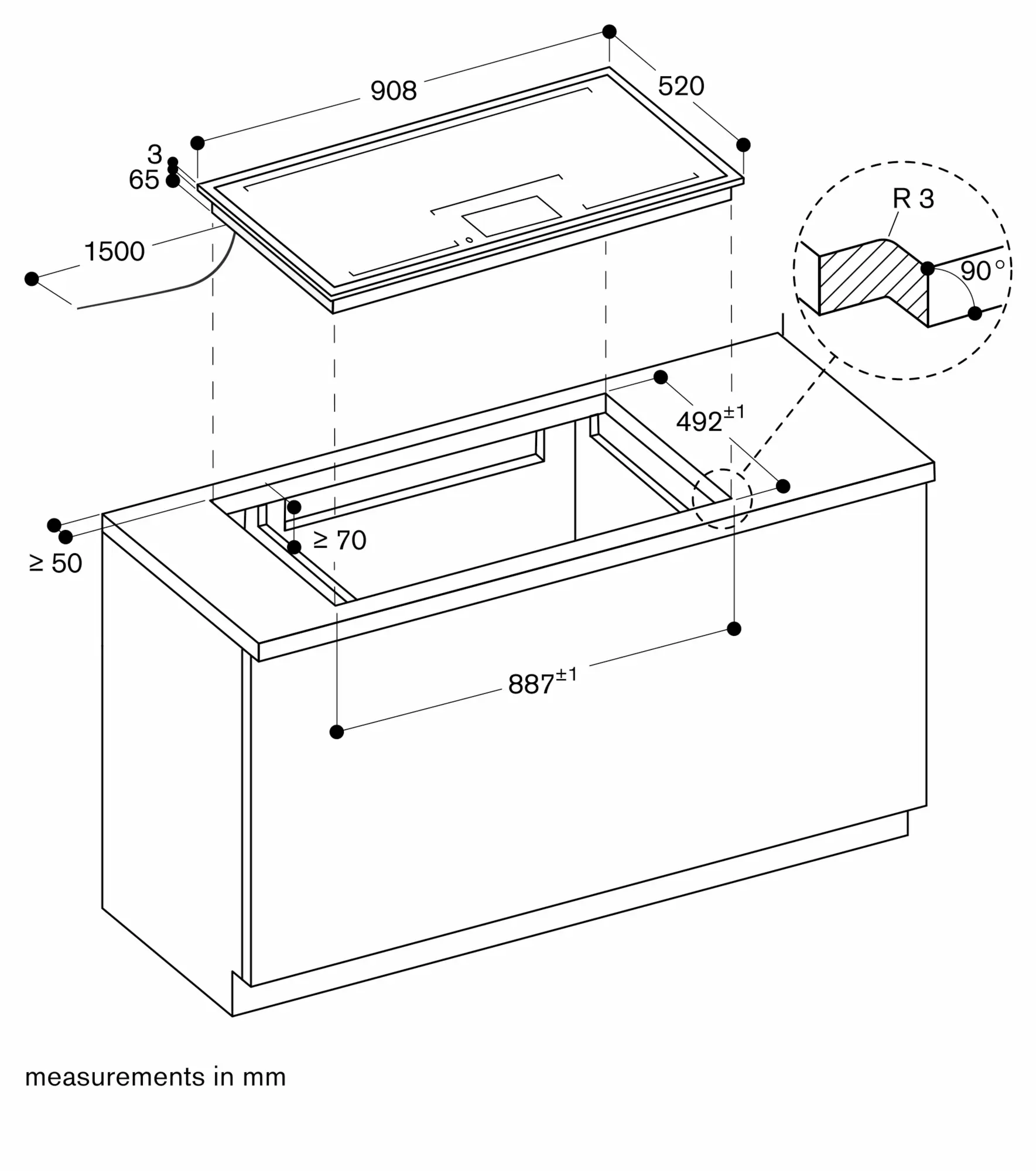 The bearing capacity and stability, in the case of thin worktops in particular, must be supported using suitable substructures. Take into account the appliance weight and additional loads.