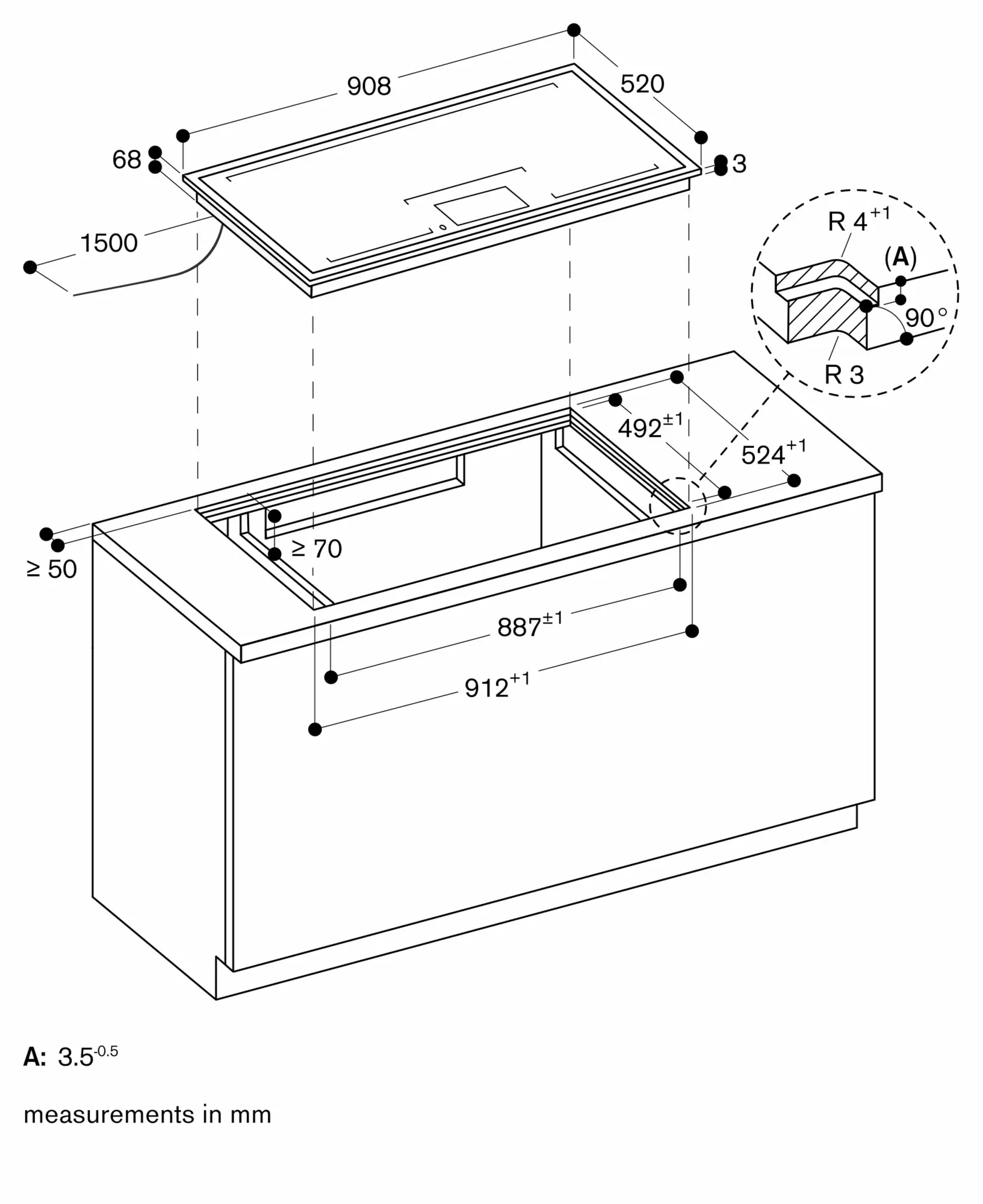 Installation is possible in worktops made of stone, synthetics or solid wood. Heat resistance and watertight sealing of the cut edges must be observed. Concerning other materials please consult the worktop manufacturer.