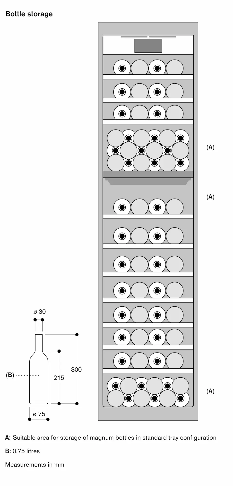 Storage of up to 6 Magnum bottles with standard tray configuration (12 bottle trays).