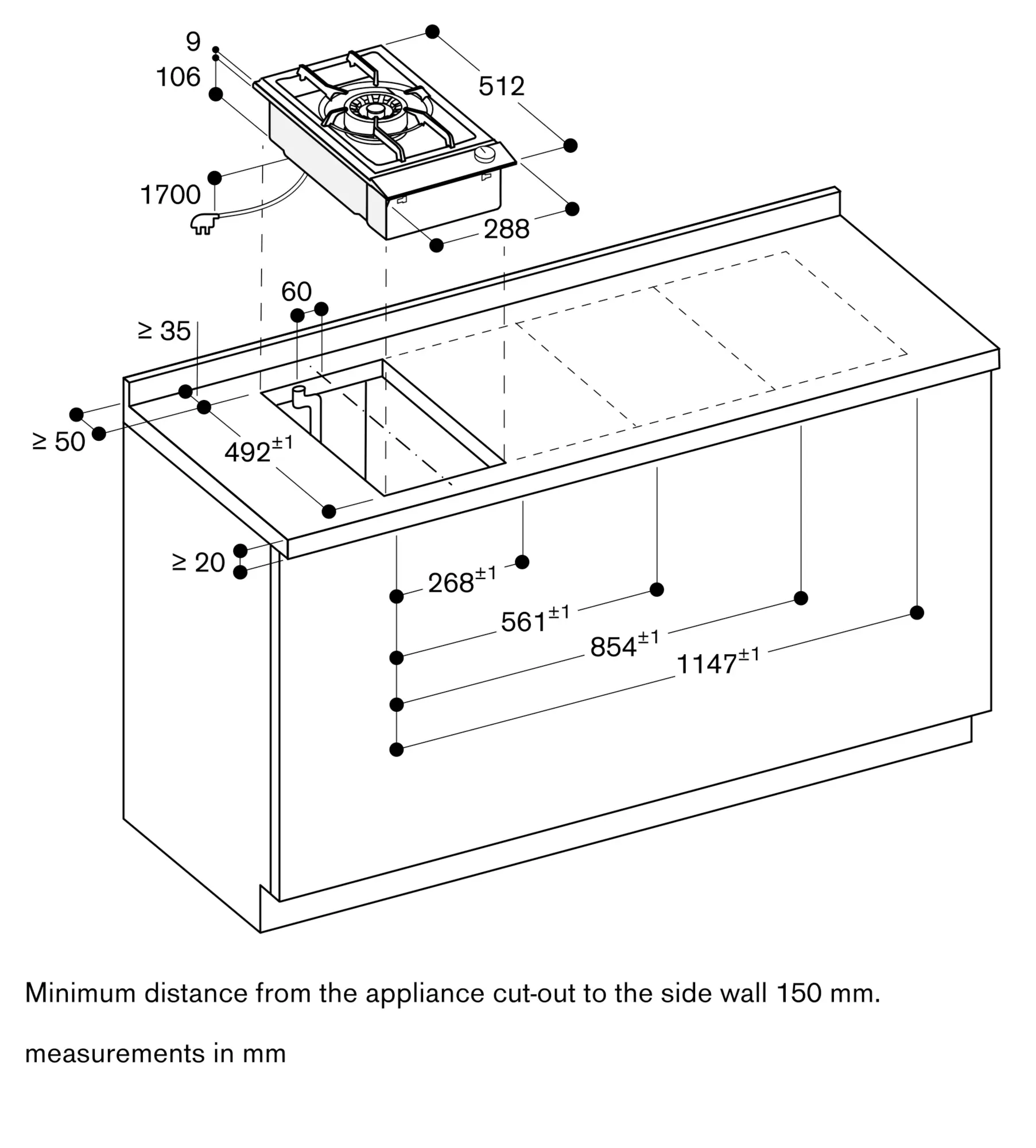 With a total connected load of more than 39.6 MJ/h local regulations concerning room ventilation, room size and combination of extraction or recirculation hoods must be observed. Minimum clearance between gas cooktop(s) with more than 39.6 MJ/h (11kW) and ventilation hood 70 cm.