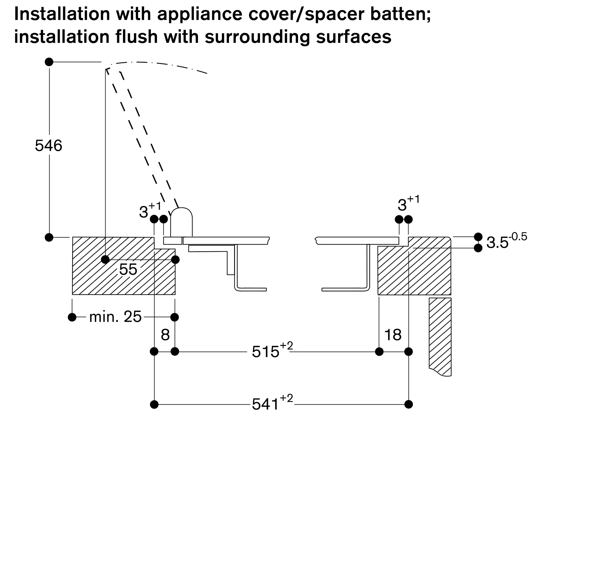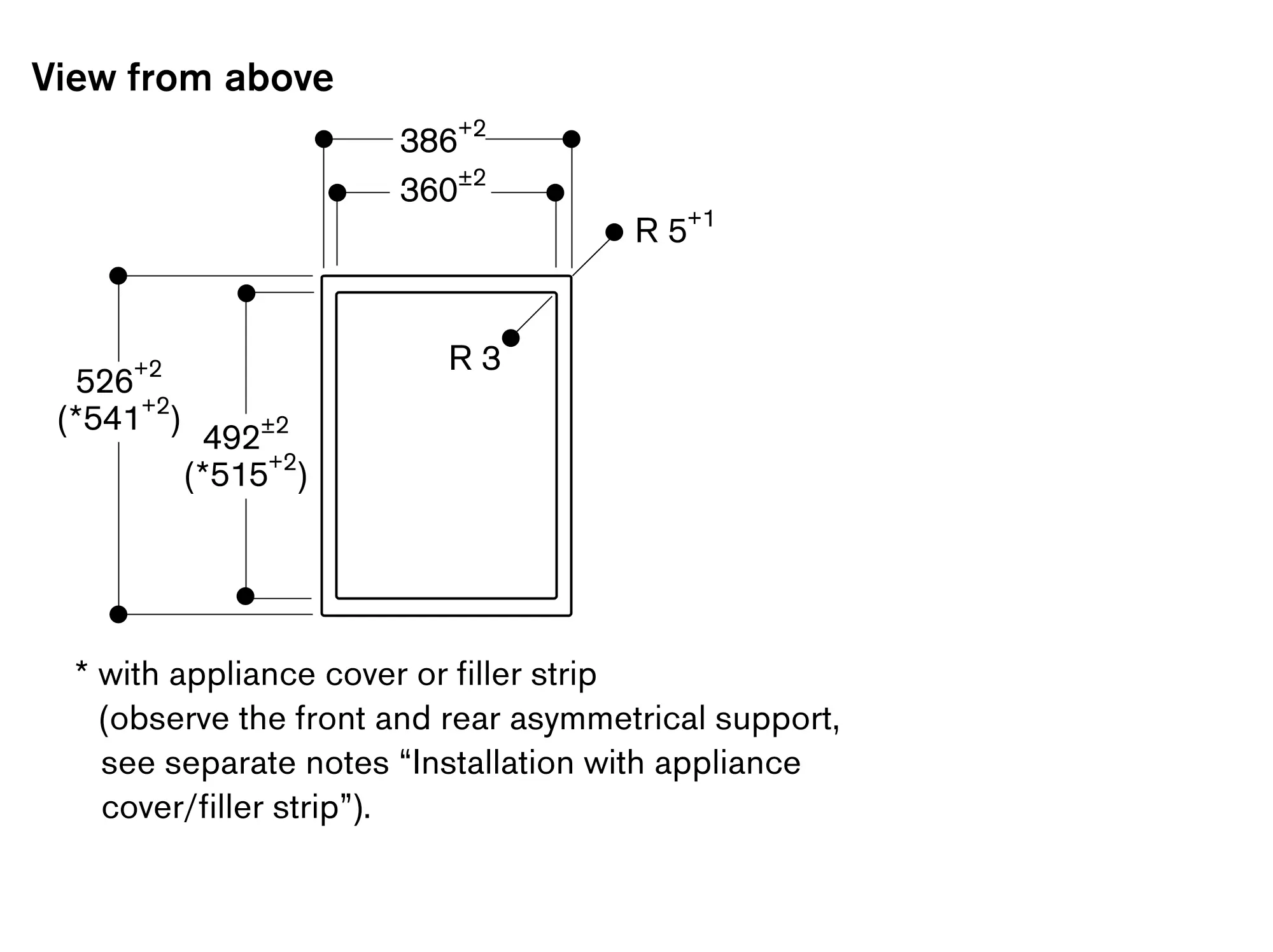The bearing capacity and stability, in the case of thin worktops in particular, must be supported using suitable substructures. Take into account the appliance weight and additional loads.