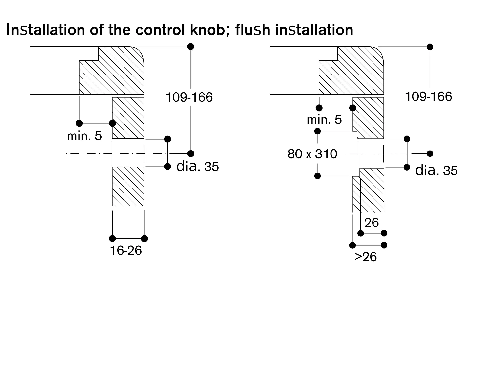The drawing "Installation of the control knob" must be observed if the panel is more than 26 mm thick (there must be a recess at the rear).
