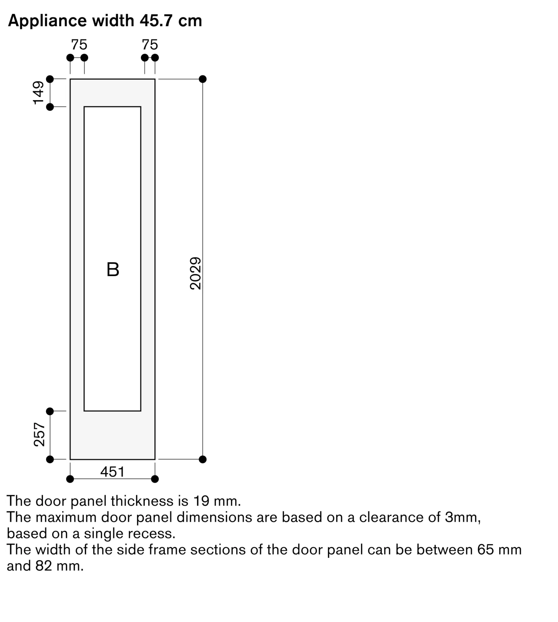 For 45.7 cm wide appliances, panel thickness 19 mm.