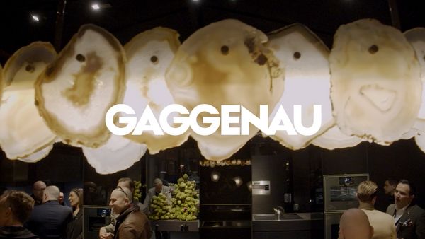 Individuals engaged in conversation with Gaggenau appliances in the background.